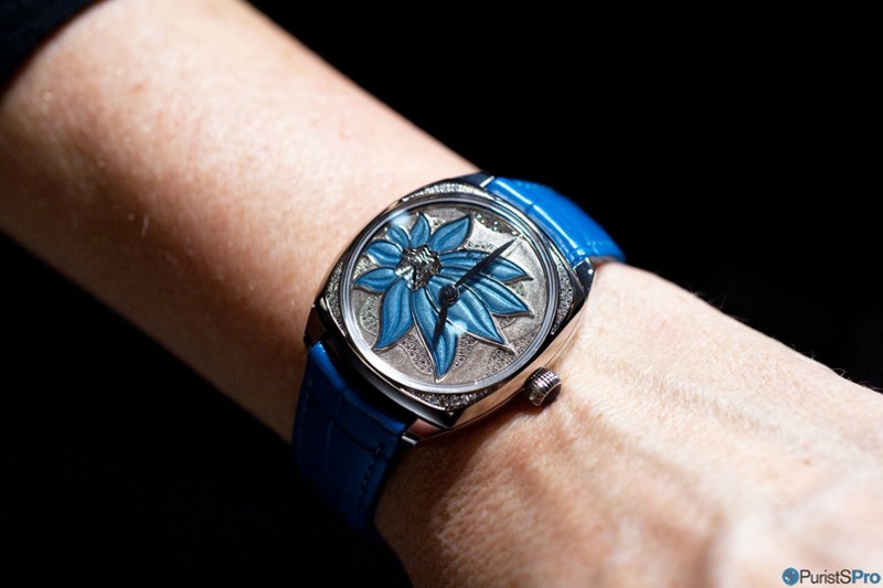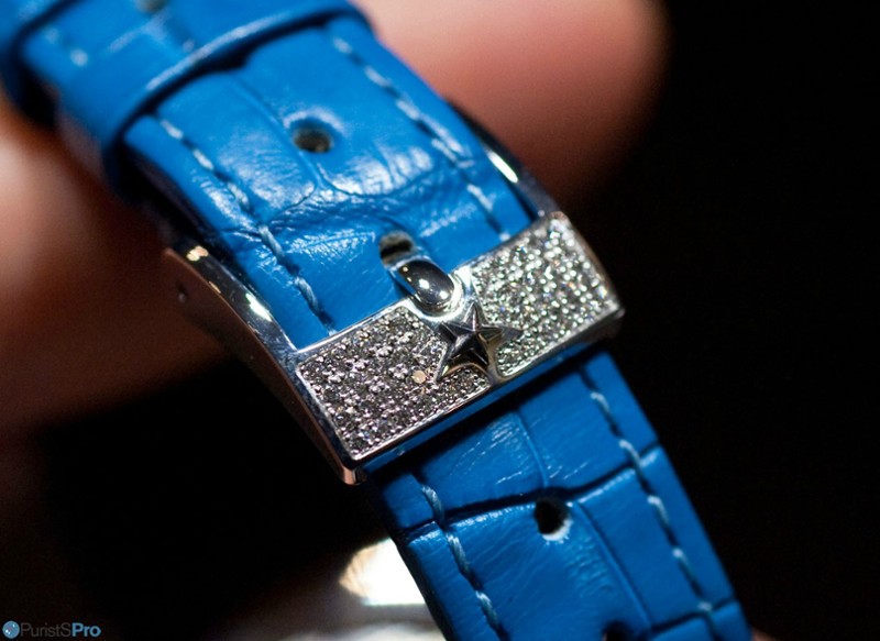 What makes the Star «Fleur Bleue» stand out of the already fine remainder of the collection is its execution with core elements of the Métier d'Arts inspired beauty: Here, a superbly handcrafted gold dial sporting a , enamelled in translucent blue using a basse-taille technique (as far as I could identify):