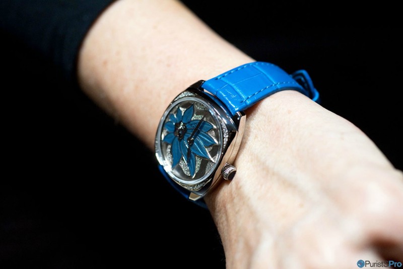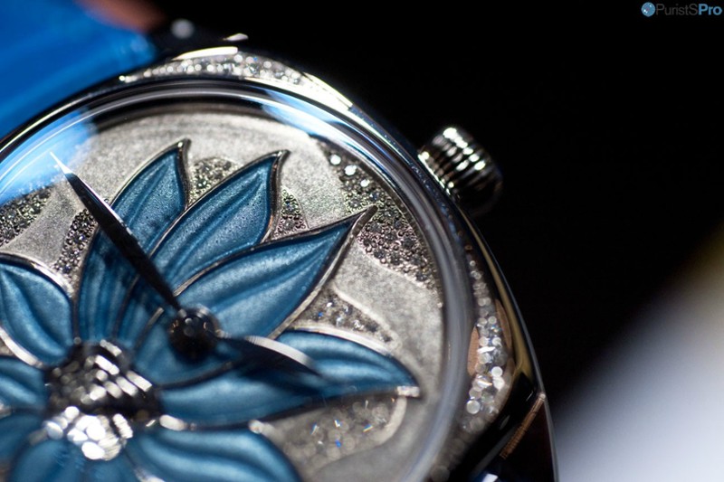 Almost as if they wanted to hide it, Zenith presented a mesmerising series of three ladies watches extensively decorated in the façon of the 'Métier d'Arts'. While two are still under embargo, here is the first of them, the Zenith Star «Fleur Bleue» :
