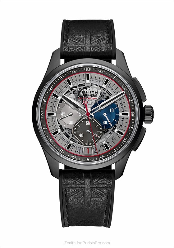 The watch features the famous and unique El Primero 4052W automatic movement housed in a titanium black DLC case measuring 45 mm in diameter, visible through its skeletonised dial.