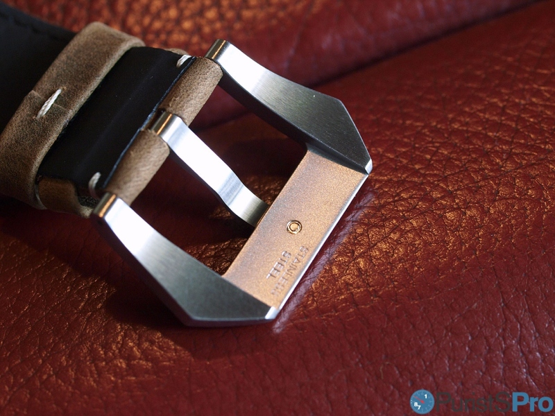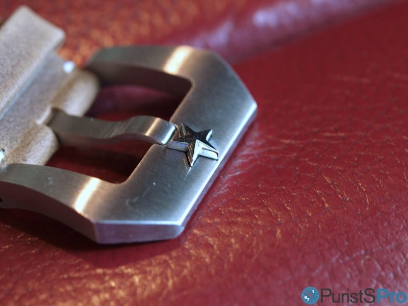 panerai-esque buckle which carries over the rich detail work of the case back. Note the polished star on top its brushed ground...