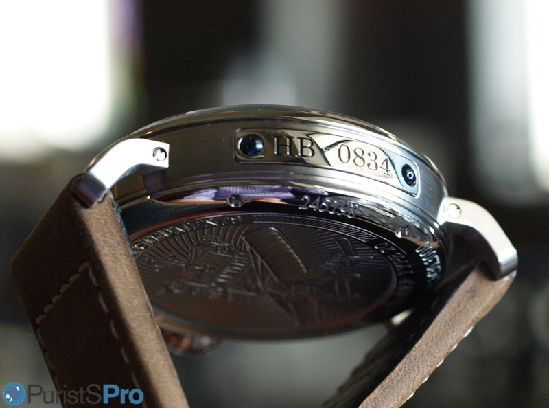 Turning over the watch reveals an insert, polished carrying an individual number just like it was done in the good old (pilot watch) times secured by blued proprietary screws:
