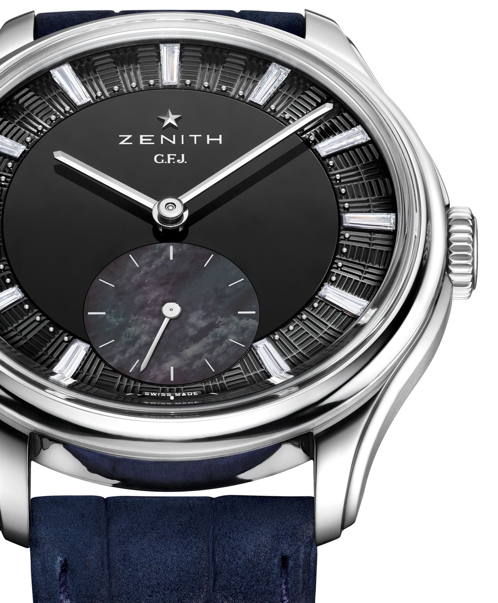 Experience the pinnacle of chronometric artistry with the G.F.J. in Tantalum. This ultra-exclusive limited edition to 20 pieces houses the legendary, COSC-certified Calibre 135 within a meticulously crafted 39.5mm tantalum case. Its refined onyx dial is adorned with exquisite baguette-cut diamond indexes, echoing a subtle brilliance.